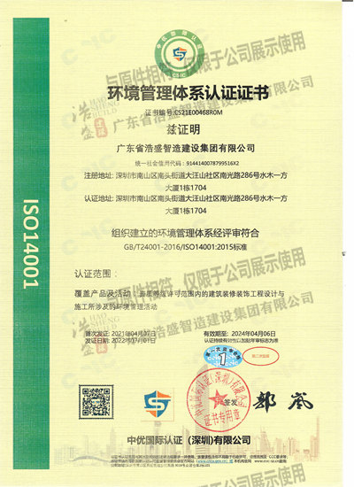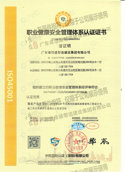 经对本公司的认证。广东浩盛建设集团有限公司荣获质量,环境,职业健康安全管理体系认证证书。